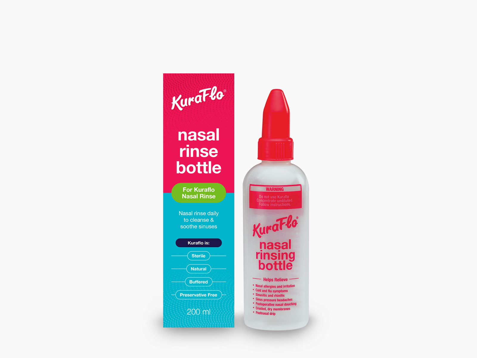 The KuraFlo Nasal Rinsing Bottle is an easy-to-use, reusable bottle designed for simply and effectively administering KuraFlo Nasal Rinse hypertonic saline solution in either 3% (for adults) or 1.5% (for children under 12 years).